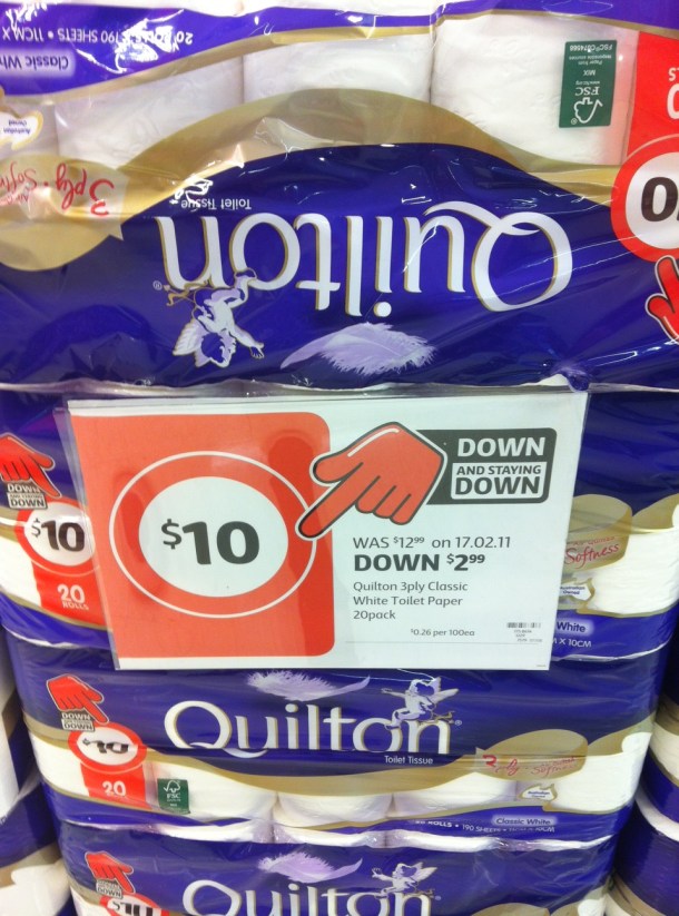 For La money, this is the pick of the bunch. Always $10, always reliable. So cheap for 20 rolls! Anyone else of fan of the Quilton? We seem to eat the stuff in our house, so achieving a suitable price v quantity ratio is important.