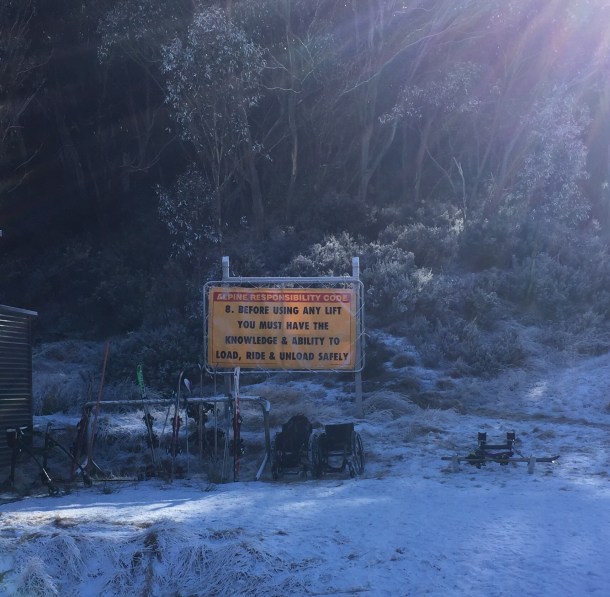 The chairlift is a hairy, scary one — yup, its official moniker is “The Easy Does It Chairlift”. Or EDI to those in the know (and trust me, everyone except me seems to be in the know in Thredbo). Shit! It’s been ferrying ski-flesh as long as I’ve been out of school? Is it safe? Does it get maintained by people who aren’t stoned and have all their teeth? *Breeeeaaathe*